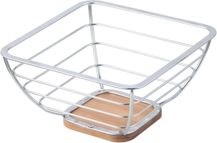 Elegant frugtskål, der kombinerer skinnende krom og naturlig bambus, velegnet både til servering og som stilfuldt interiørtilbehør. Takket være den stabile firkantede bambusbase tilbyder den øget stabilitet og sikker opbevaring af frugt.