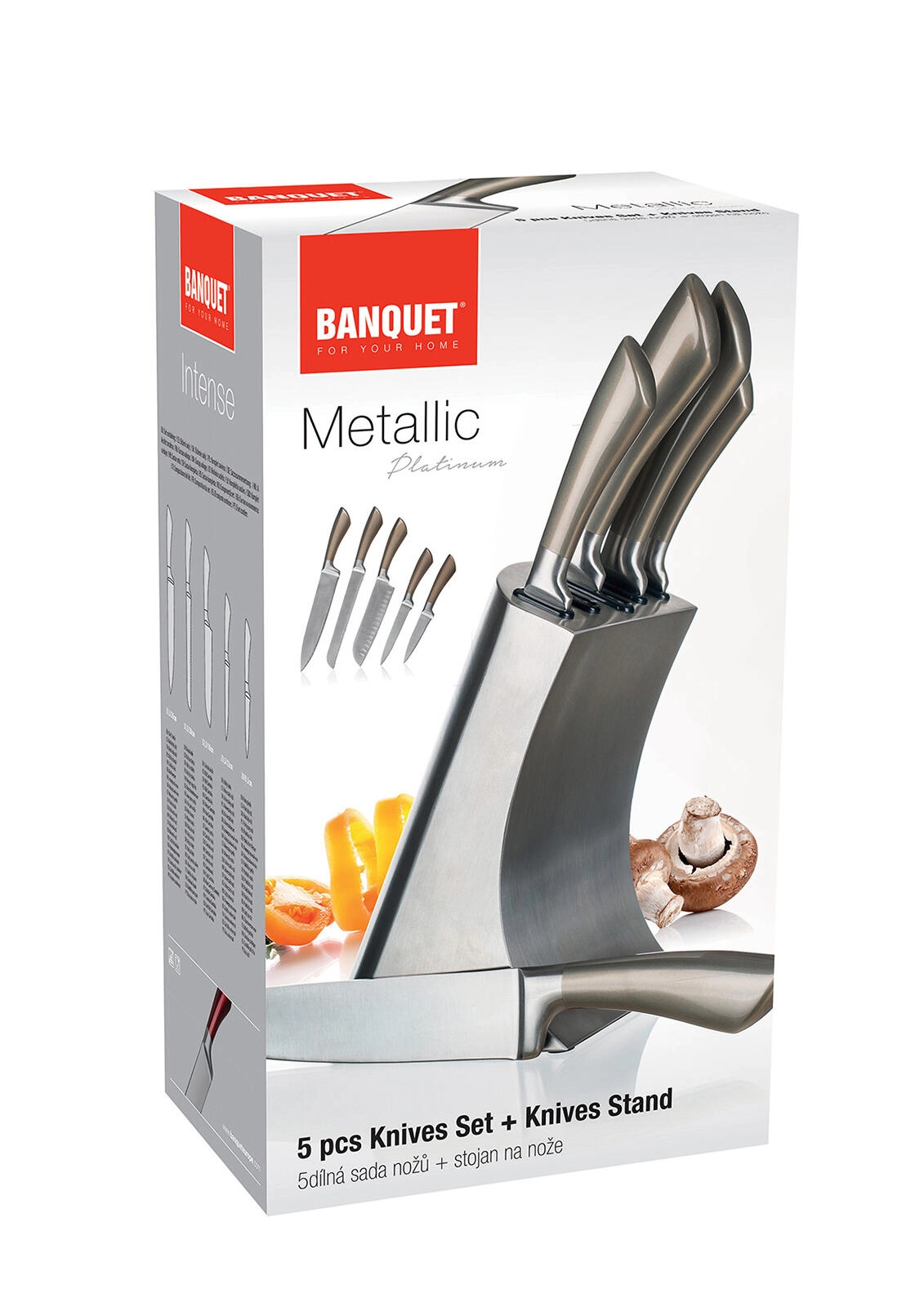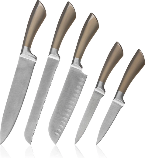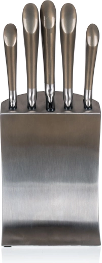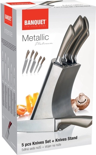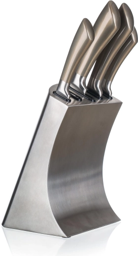 Sættet METALLIC Platinum kombinerer moderne udseende med funktionalitet. Knivene i rustfrit stål tilbyder pålidelig skarphed og nem vedligeholdelse, mens det stabile metalstativ holder klinger sikre og lige ved hånden. Perfekt til ethvert køkken, hvor både ydeevne og design er vigtige.