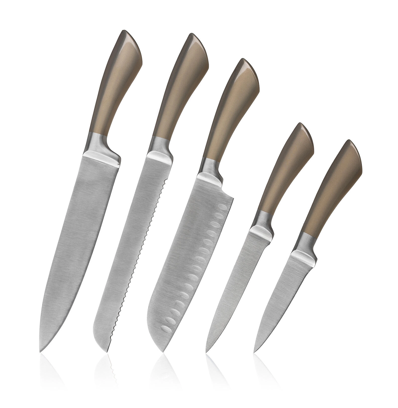 Knive og stativ er lavet af kvalitets rustfrit stål med børstet overflade. De modstår korrosion, er lette at rengøre og forbliver skarpe længe for pålidelig ydeevne i køkkenet.