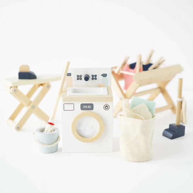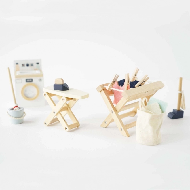 Vaskerumssættet giver børn realistisk og samtidig kreativ leg. Den høje kvalitet i bæredygtige materialer og fokus på detaljer sikrer lang holdbarhed og et smukt udtryk i ethvert dukkehus. Med tilbehør som vaskemaskine, tørrestativ og strygejern træner børn finmotorik og koordination og udvikler fantasien.