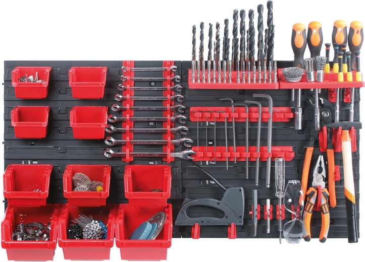 Montering på væg er hurtig og enkel; systemet er ideelt til garager, værksteder og gør-det-selv-hjørner i hjemmet. Aftagelige bokse gør håndteringen af småmateriale lettere, og universelle slots rummer kroge, værktøjsholdere og bitstativer.