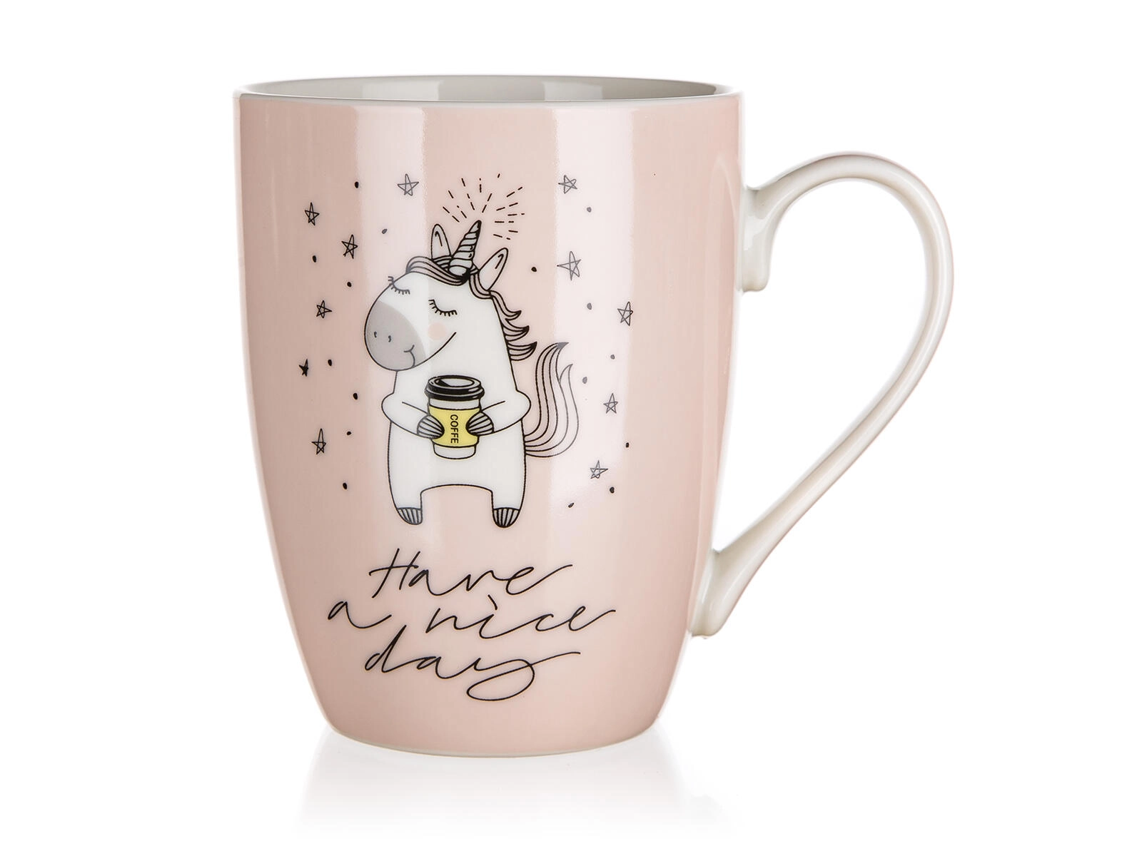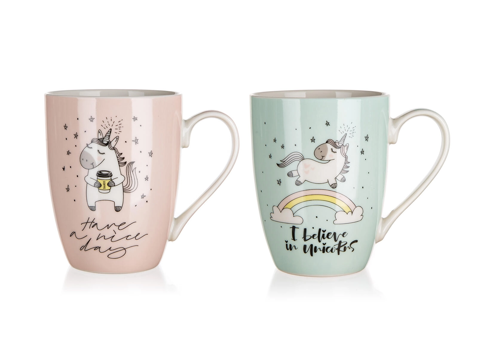 Krusset fås i to designs – med teksterne “I believe in unicorns” og “Have a nice day”. Øverste diameter ca. 8 cm, nederste diameter ca. 5,5 cm. Takket være nem vedligeholdelse i opvaskemaskinen og mulighed for opvarmning i mikroovnen er det et praktisk supplement til ethvert køkken.