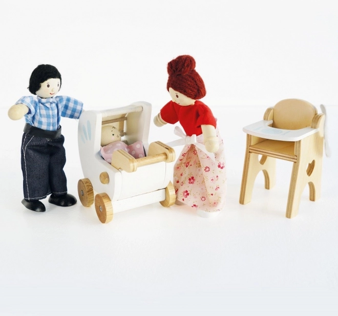 Sødt træsæt til fantasifuld leg med baby fra mærket LE TOY VAN. Indeholder barnevogn, høj stol, spisesæt og taske. Tekstildetaljerne er håndsyede, og alle dele er fremstillet af kvalitetsgummitræ. Legetøjet er dekoreret med ikke‑giftige vandbaserede farver, er etisk fremstillet og understøtter kreativitet, finmotorik og koordination.