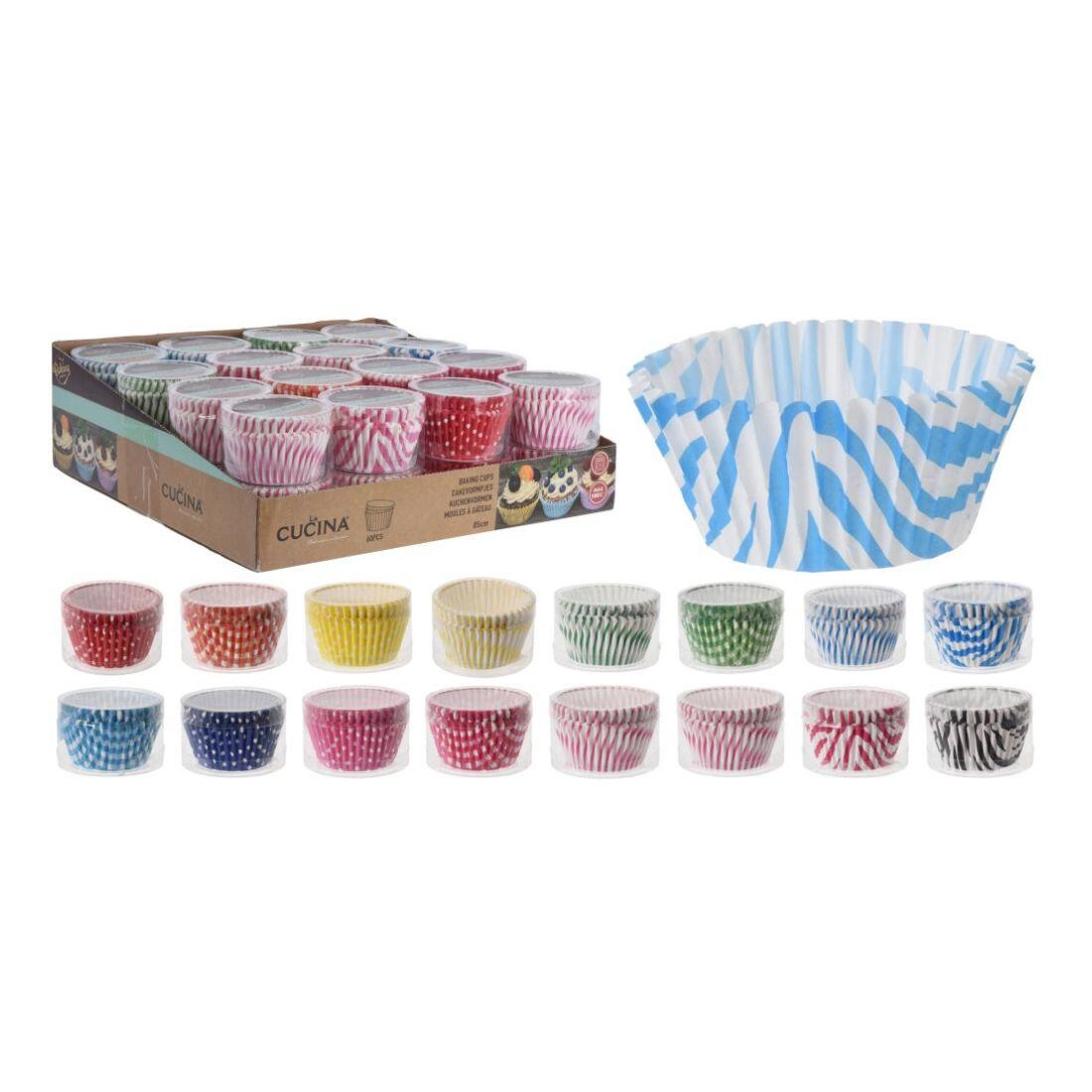 Praktiske papirforme til konfekt i størrelsen 5 × 3,5 cm i et farverigt mix af prikker og striber er ideelle til både bagning og servering. I pakken finder du 60 stk. forme af kvalitetsbagepapir, som egner sig til småkager, praliner, chokoladebonbonner og mini muffins. Skab smukt anrettede desserter til enhver lejlighed med et farvemix, der liver op på både søde og salte borde.