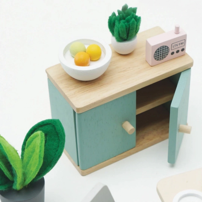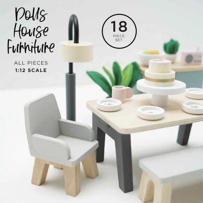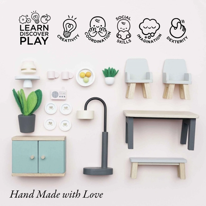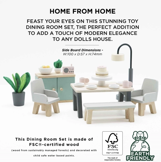 Dette charmerende spisestue sæt er lavet af højkvalitets FSC-certificeret træ og tilføjer et strejf af sofistikering til ethvert dukkehus. Indeholdt er 18 elementer, inklusive bord, to stole, bænk, lampe, skænk og dekorative accessories som planter, en skål med frugt og kage. Dette sæt ser ikke kun smukt ud, men fremmer også børns kognitive og kommunikative færdigheder. Det er dekoreret med ikke-giftige farver baseret på vand og er kompatibelt med andre Le Toy Van Dukkehuse.