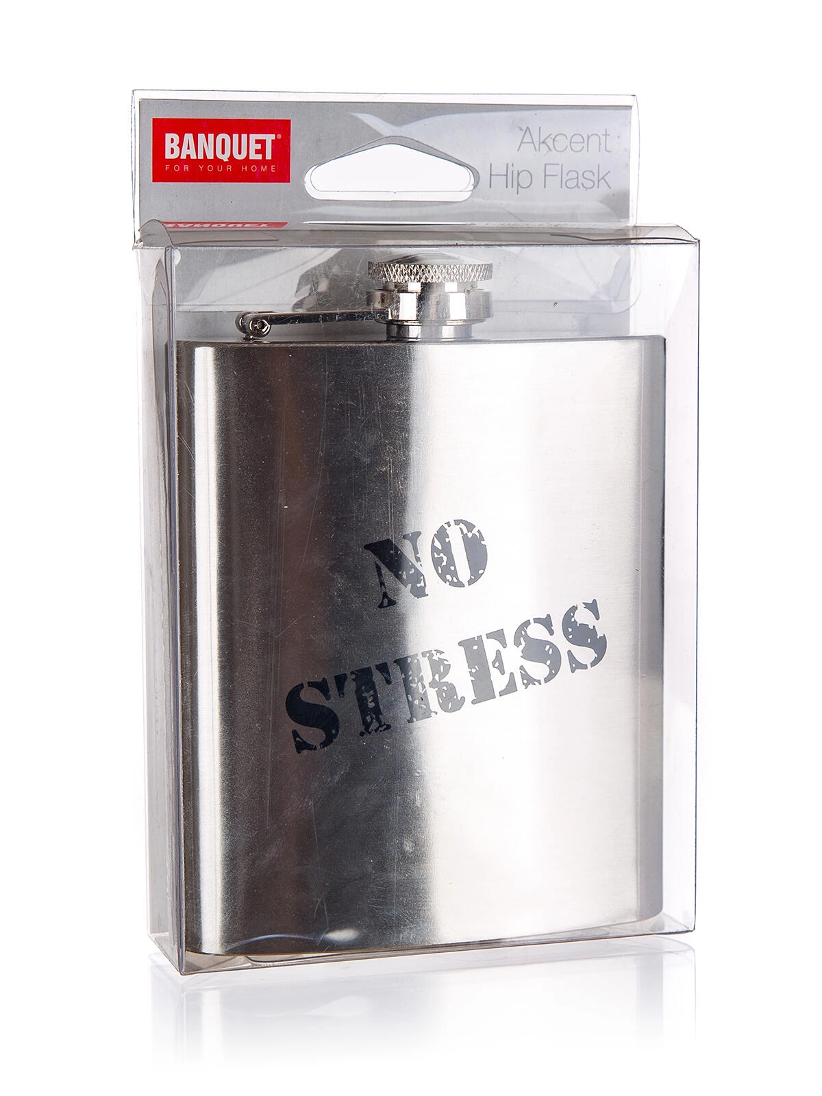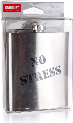Stilfuld rustfri stål lommeflaske Akcent med trykket “No Stress” er den ideelle ledsager på rejser, udflugter og i fritiden. Takket være de kompakte mål og et volumen på 200 ml gemmer du nemt din yndlingsdrik i lommen. Det robuste rustfri stål-design sikrer lang levetid og nem vedligeholdelse.