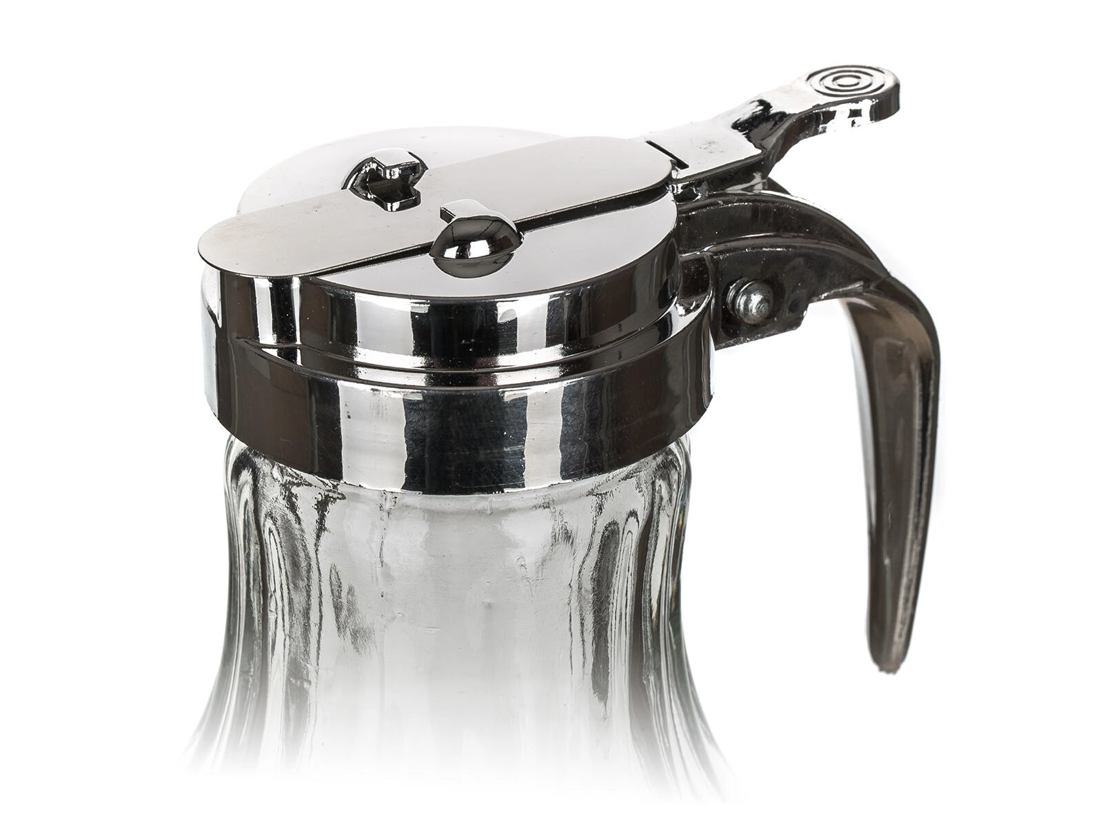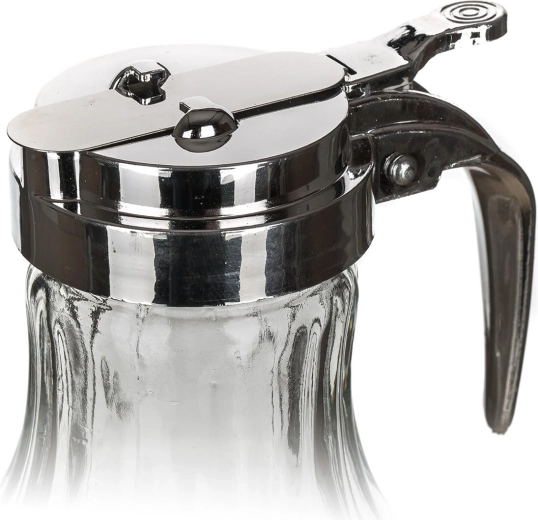 Hængslet låg med vippearm giver kontrolleret gennemstrømning uden dryp – ideelt til honning, fløde og sirupper.