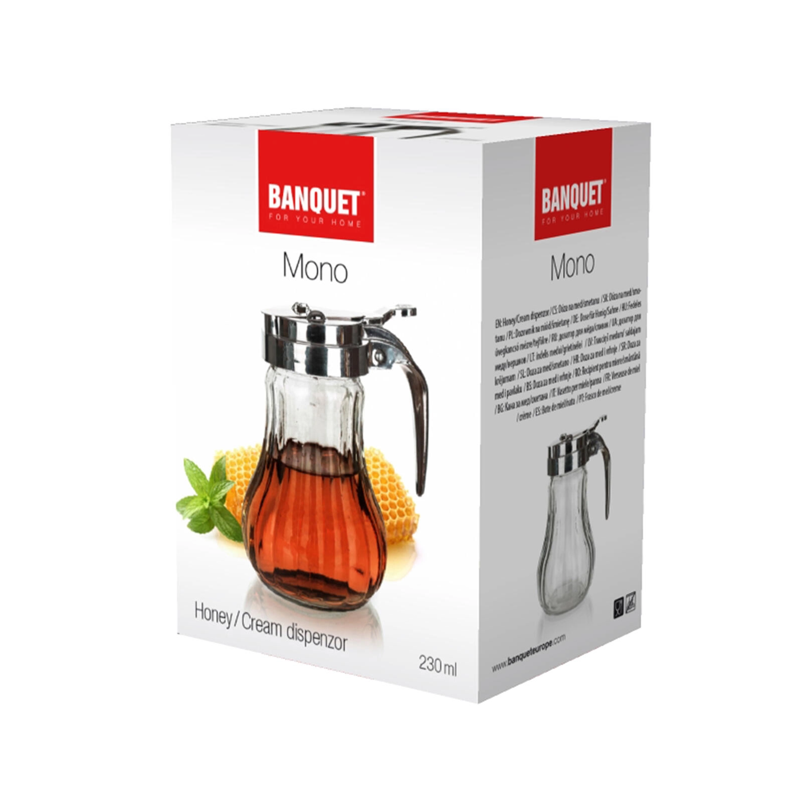 Honning- og flødedåsen MONO 230 ml kombinerer tidløst design med funktionalitet. Det riflede glaslegeme ligger godt i hånden og gør det let at se indholdet, mens låget i rustfrit stål med vippemekanisme gør præcis og ren hældning med én hånd let.