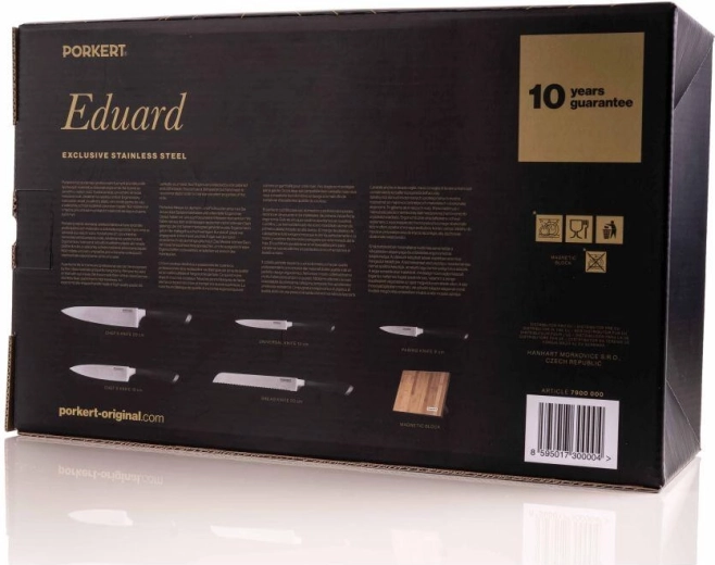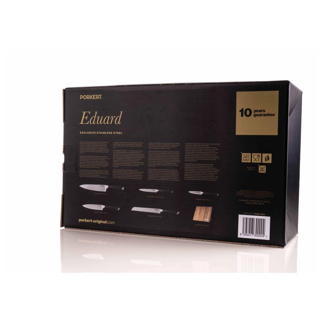 Forkæl dig selv med præcis skæring hver dag med knivsættet EDUARD af ædelt tysk stål X50CrMoV15 og en elegant magnetisk bambusblok. Skarpe klinger med ideel slibevinkel sikrer præcis og nem skæring af brød, kød og grøntsager, det robuste håndtag ligger godt i hånden, og fingerbeskytter øger sikkerheden under arbejdet.