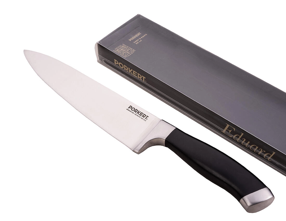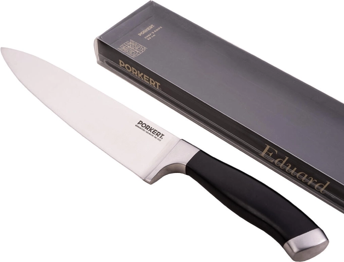 Den alsidige kokkekniv EDUARD med en bladlængde på 20 cm er en pålidelig hjælper til daglig snitning, hakning og udskæring. Den tilbyder kvalitetsstål X50CrMoV15, hårdhed HRC 55 ±2 for langvarig skarphed og et holdbart, poleret plastikhåndtag for et sikkert og behageligt greb.
