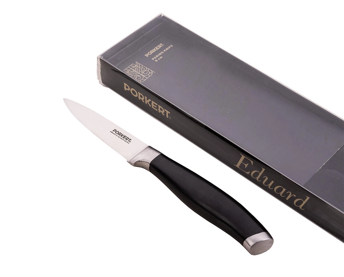 Udstikkerkniven EDUARD med en bladlængde på 9 cm er en fremragende hjælper til finere køkkenopgaver. Takket være kvalitets rustfrit stål X50CrMoV15 (ISO 1.4116) bevarer klingen sin skarphed i lang tid og giver et rent, præcist snit. Det ergonomiske håndtag af holdbar poleret plast sikrer et komfortabelt og sikkert greb.