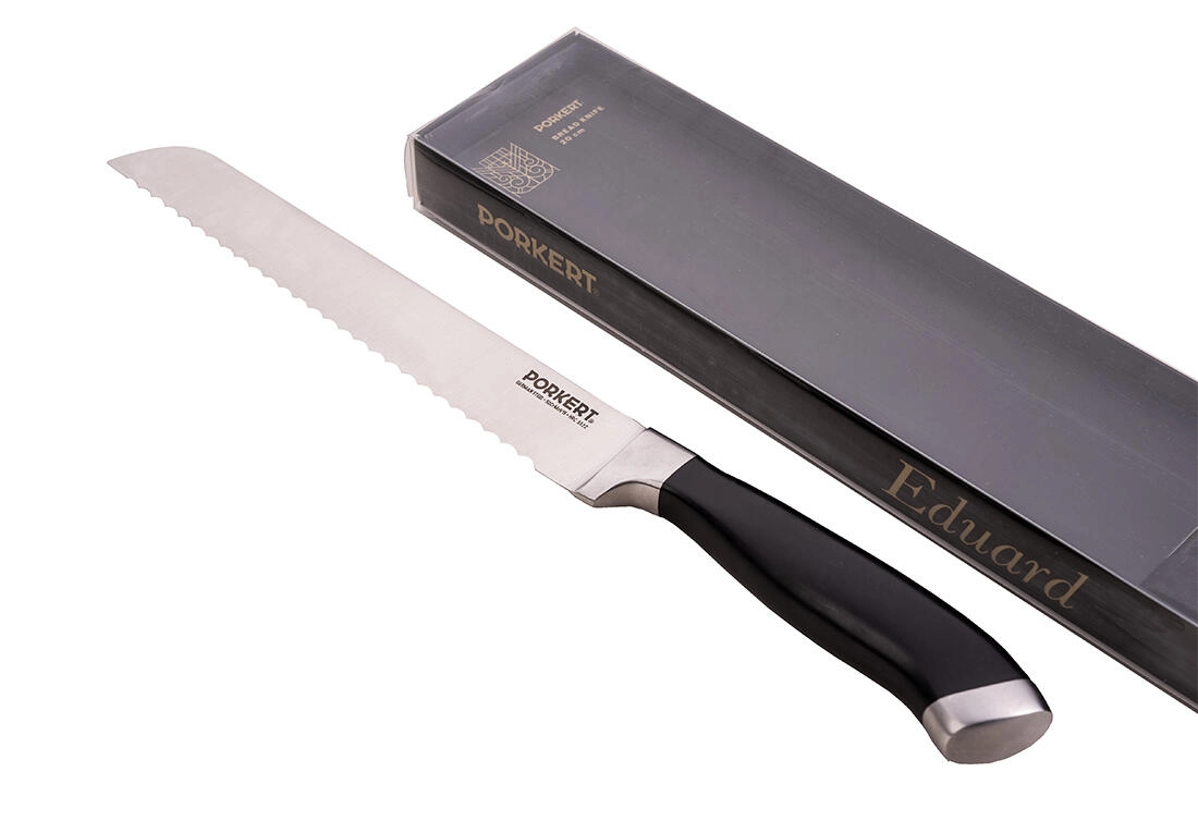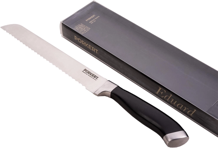 Brødkniven EDUARD er designet til præcis skæring af bagværk – fra sprøde baguetter til frisk brød. Det kvalitetsstål X50CrMoV15 (ISO 1.4116) med en hårdhed på HRC 55 ±2 tilbyder pålidelig skarphed og modstand mod slitage. Det polerede plastikhåndtag ligger godt i hånden og øger komforten og sikkerheden under skæring.