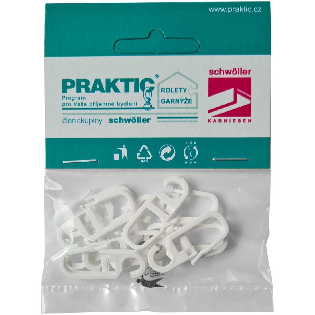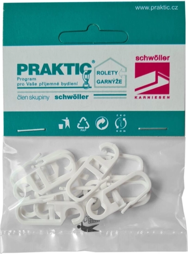 Praktisk gardinkrog af holdbar plast i hvid farve til nem montering af gardiner. Ideel til daglig brug, kompatibel med almindelige systemer. Nem installation, ren hvidt design og pakke med 10 stk. til komplet montering af skinner.