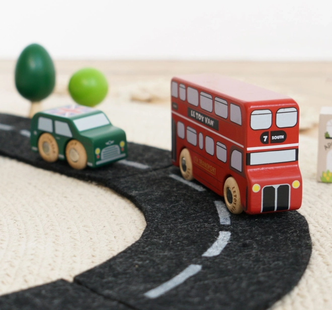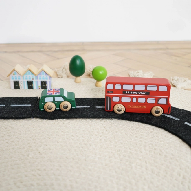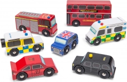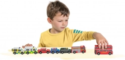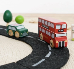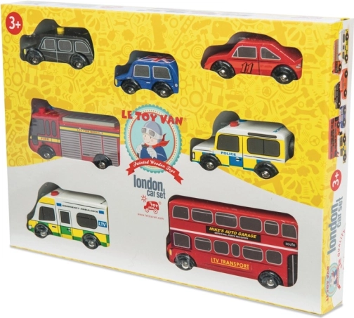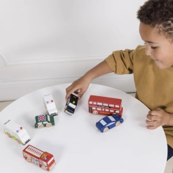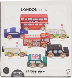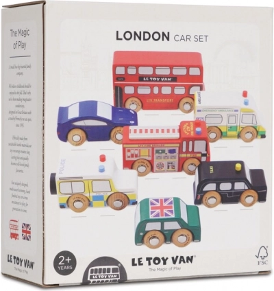 Dyk ned i de travle londonske gader med detaljerede træ-køretøjer fra Le Toy Van. Sættet indeholder en dobbeltdækkerbus, en sort taxa, en brandbil, en ambulance, en politibil og to personbiler. Den robuste konstruktion i bæredygtigt gummitræ og de glatte kanter er ideelle til små hænder, der under legen træner greb, hånd-øje-koordination og fantasi.