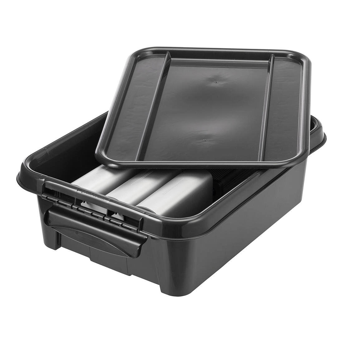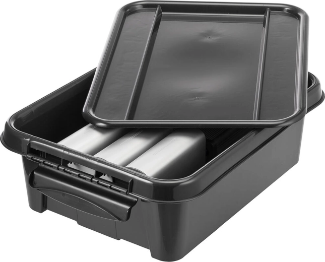 Den holdbare sorte boks med låg i genanvendt PP er en pålidelig løsning til den daglige organisering. Den holder styr på små og mellemstore genstande og lukker alt sikkert inde takket være det solide låg og clips, så det beskyttes mod støv.