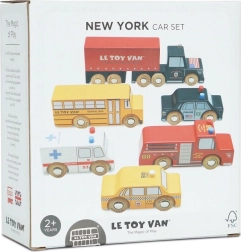 Skolebus, brandbil, ambulance, politibil, taxa og leddelt lastbil udgør et farverigt sæt, som inspirerer til historier fra storbyens travle gader.