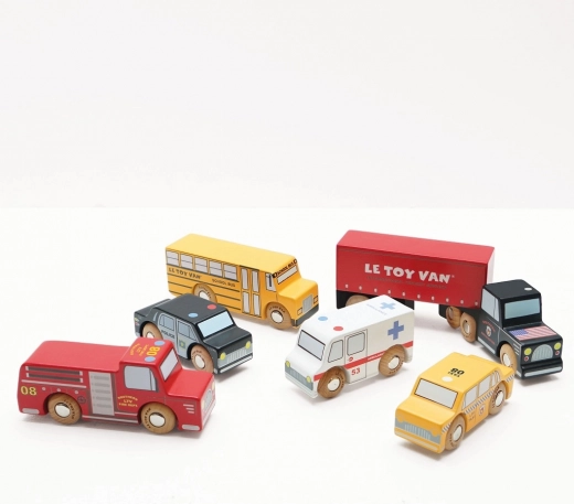 Denne farverige kollektion indeholder en leddelt lastbil med ti hjul, en gul skolebus, en politibil, en gul taxa, en ambulance og en brandbil. Omhyggelige detaljer og hjul, der ruller let, inviterer børn til åben leg, hvor de skaber historier og træner hånd–øje-koordination.