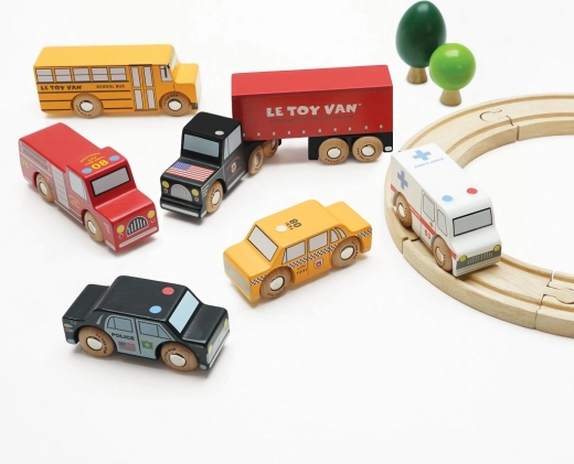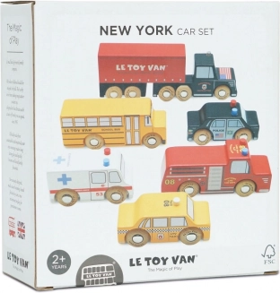 Opdag et legende sæt med seks træbaserede køretøjer fra LE TOY VAN inspireret af New York, fremstillet af bæredygtigt FSC-træ og malet med giftfri vandbaserede farver. Sættet fremmer fantasifuld leg, udvikler finmotorik og er kompatibelt med trægarager og togbane fra LE TOY VAN og andre mærker.