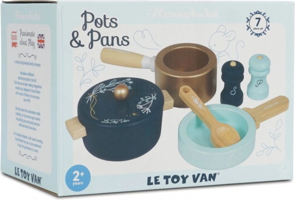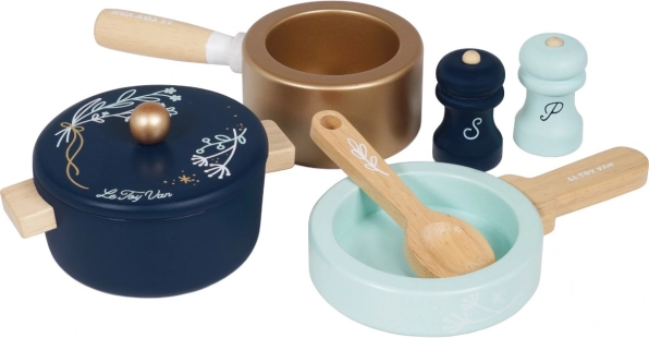 Gryde med låg, kasserolle, pande og trætilbehør stimulerer fantasifuld leg og efterligning af rigtig madlavning.