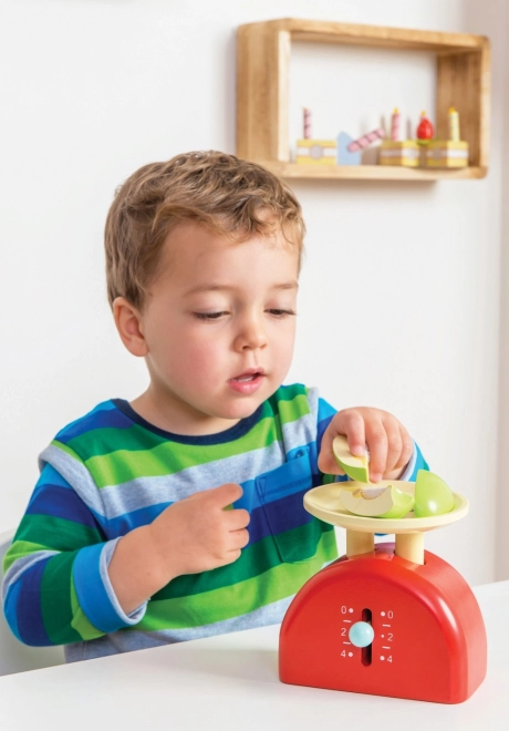 En stilfuld træ-køkkenvægt fra Honeybake-kollektionen af LE TOY VAN er det perfekte tilbehør til børnekøkkenet eller butikken. Den tilbyder realistisk vejning takket være en smart bevægelig arm, er håndmalet med ikke‑giftige vandbaserede farver, og der medfølger to delte æbler med velcro til endeløse legescenarier.