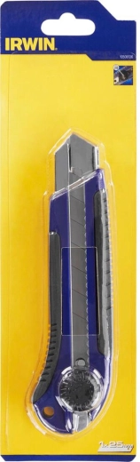 Irwin afbryderkniv med 25 mm blad er et ideelt valg til værksted, byggeri og hjemmebrug. Takket være den robuste konstruktion og strammeskruen holdes bladet fast på plads, hvilket øger både sikkerheden og skærekvaliteten. Det ergonomisk formede håndtag sikrer komfort selv ved længere tids arbejde.