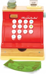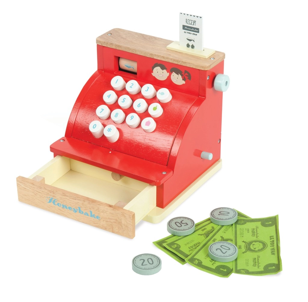 Det røde trækasseapparat fra LE TOY VANs prisbelønnede Honeybake-kollektion kombinerer høj kvalitet, sikre materialer og et charmerende vintage-look med gyldne detaljer. Ideelt til butikssleg og udvikling af sociale færdigheder, kreativitet og grundlæggende matematiske kompetencer.