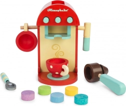 Denne kvalitets trækaffemaskine giver børn en autentisk oplevelse af at lave kaffe. Farvede kapsler kan sættes i portafilteret og “brygge” drikken direkte i den malede kop, og der medfølger også mælkeskummer og ske. Kapslerne kan nemt opbevares i åbningen øverst på kaffemaskinen, så alt er lige ved hånden.