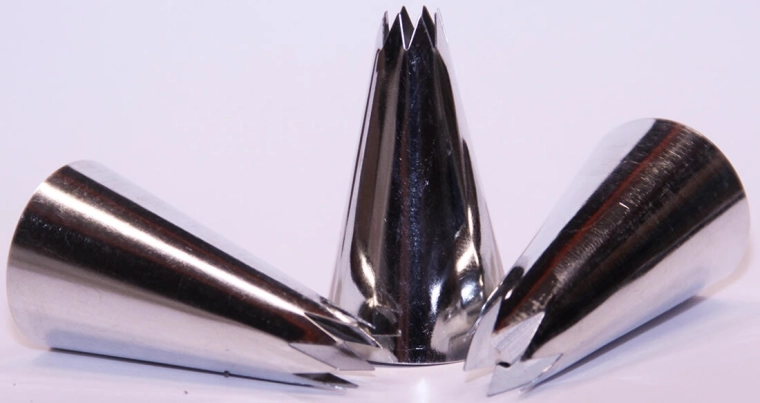 Dyserne er fremstillet af holdbar, fortinnet plade, som sikrer lang levetid og formstabilitet. De kan bruges med almindelige bomuldssprøjteposer, og takket være den store åbning er de egnede til mere faste cremer og fyld.