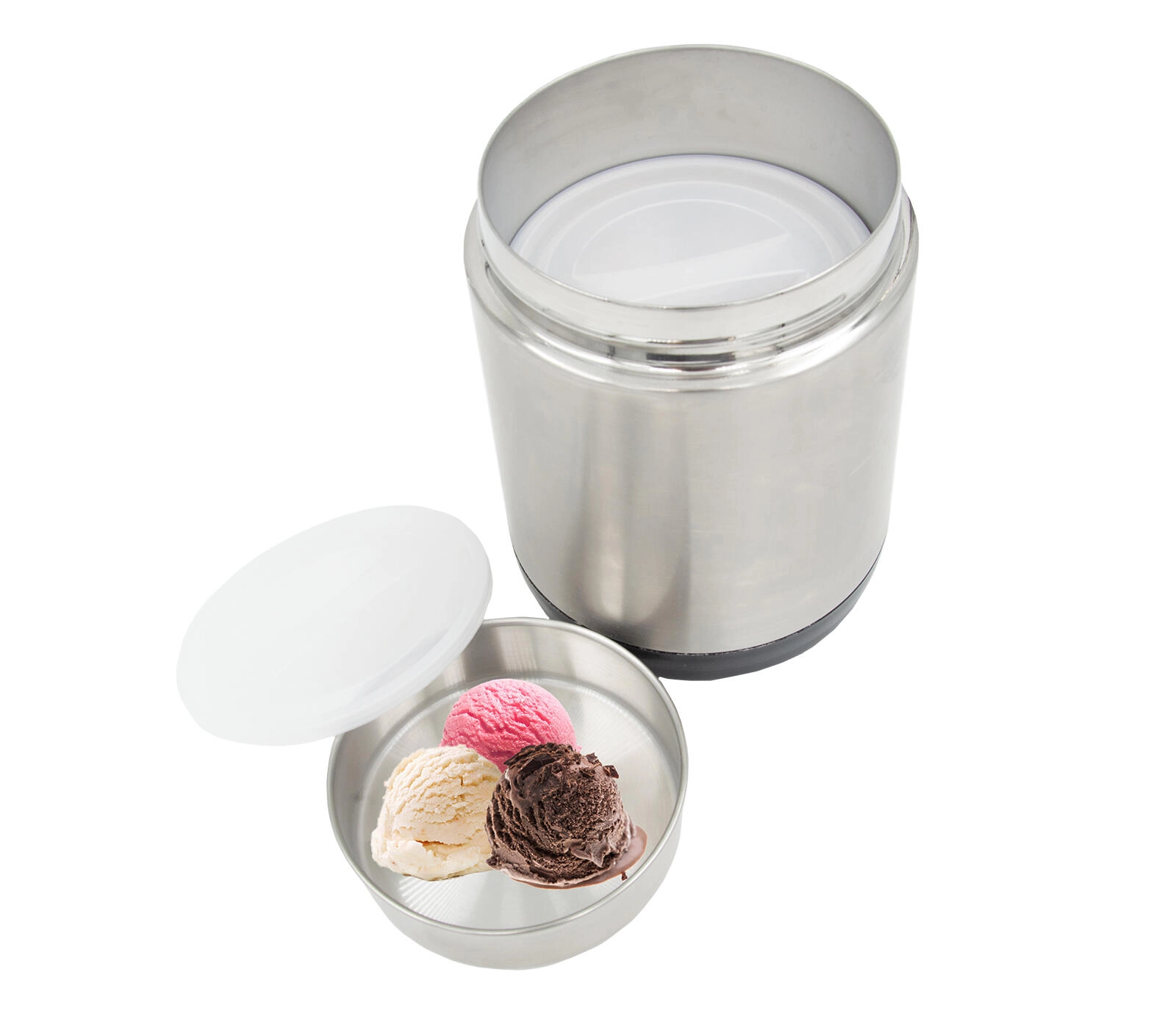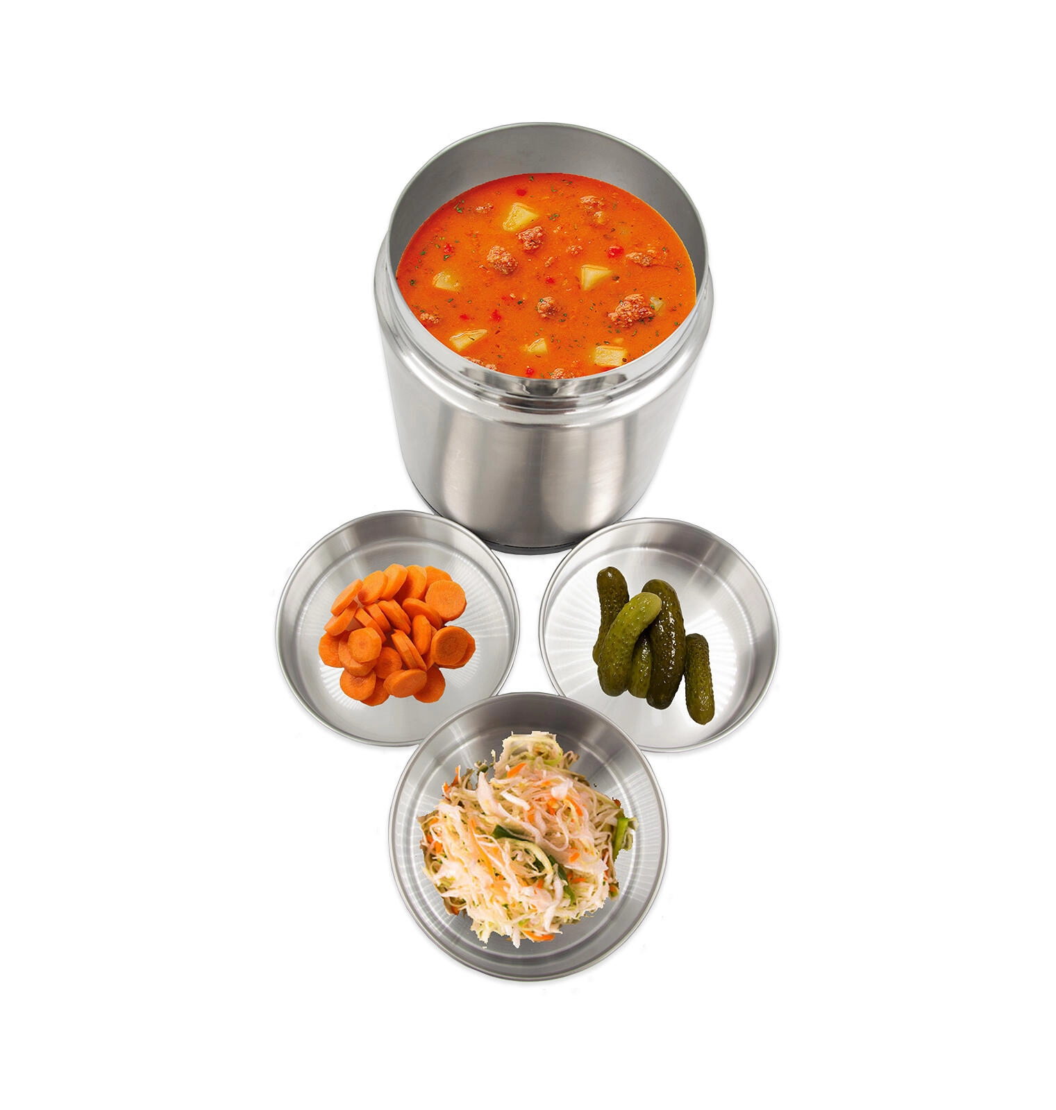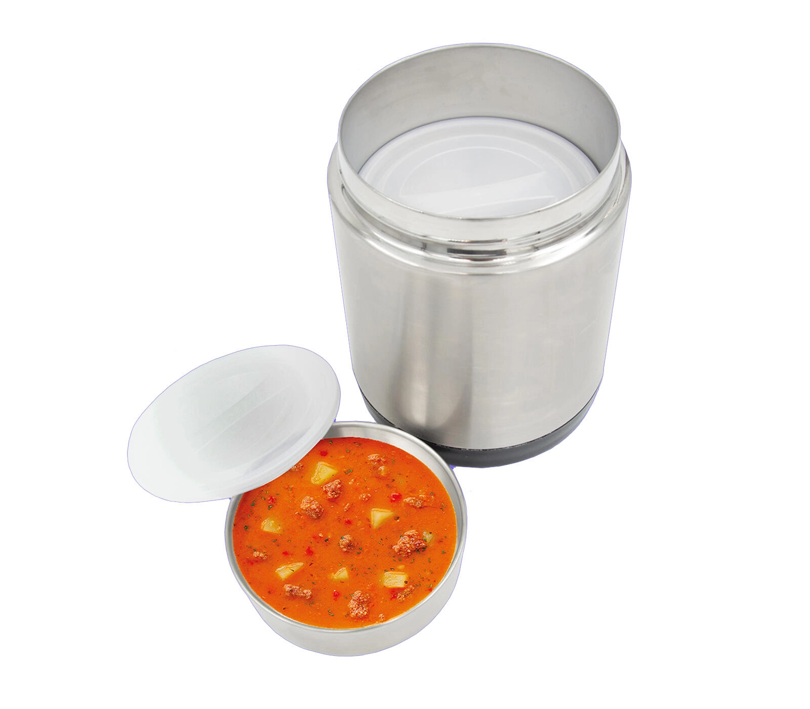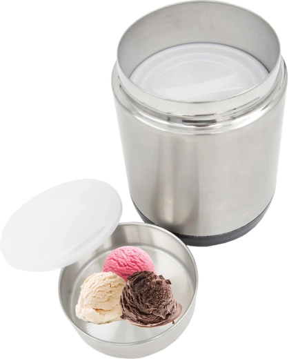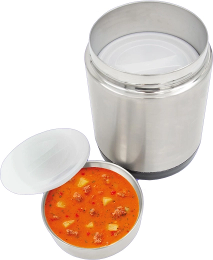 Når skålene er taget ud, kan beholderen bruges som en rummelig madboks til supper, risotto eller saucer. Den brede åbning gør påfyldning og rengøring let, og det kvalitetsrige rustfri stål sikrer lang levetid. Perfekt til daglig brug på arbejde, under rejser, til sport og for dem, der ikke spiser på restaurant. Termobeholderen er også velegnet til kolde desserter, for eksempel is.