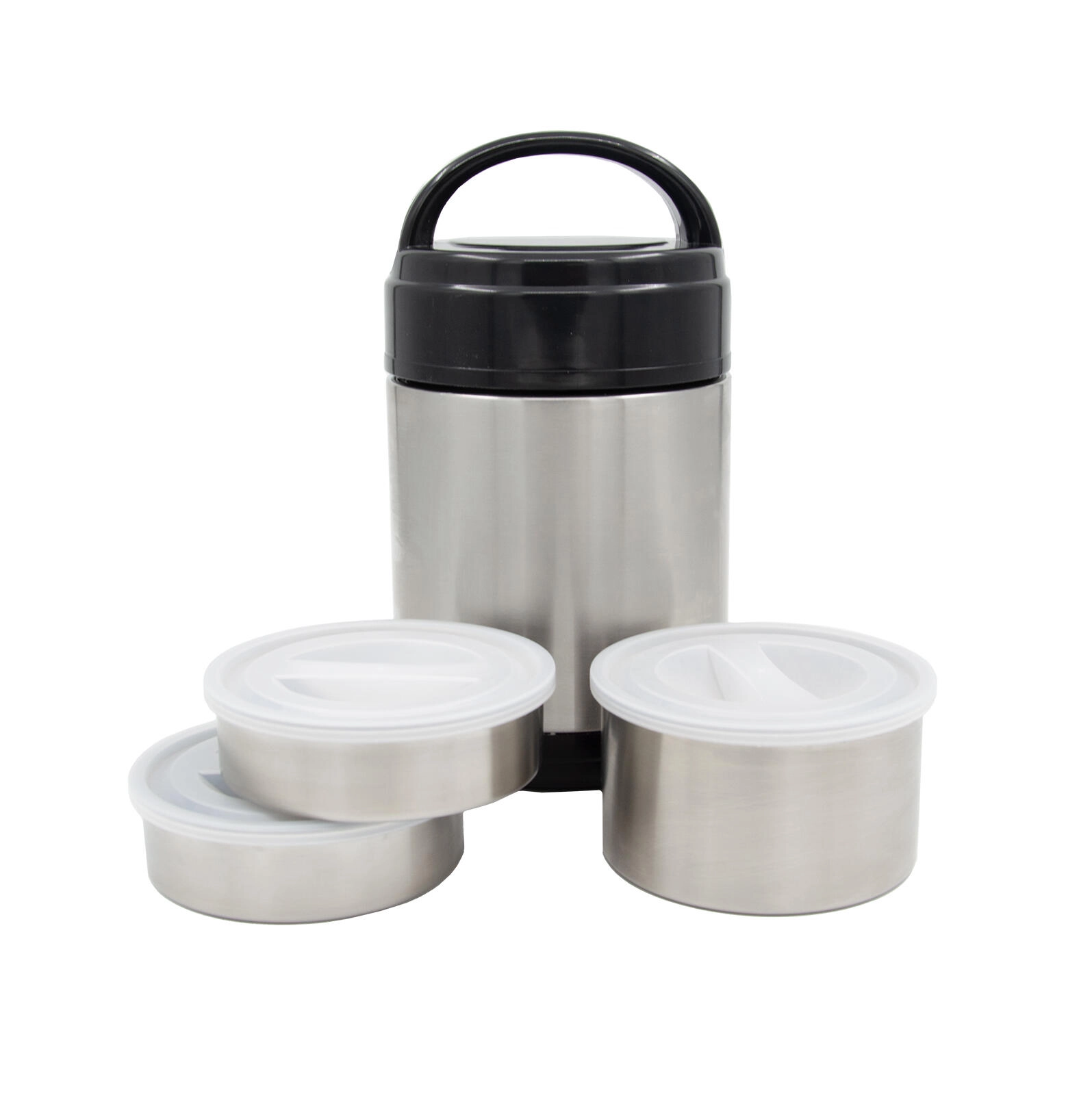 Madtermoflasken med en diameter på 11 cm kombinerer robust rustfrit stål med praktiske plastdetaljer. Indeni finder du tre separate skåle – to på 0,25 l og én på 0,5 l – hver med et tætsluttende plastlåg. Det gør det muligt sikkert at adskille de forskellige retter, bevare friskheden og servere bekvemt. Den ydre plastbund reducerer støj ved ned­sætning, og det solide håndtag gør transporten lettere.
