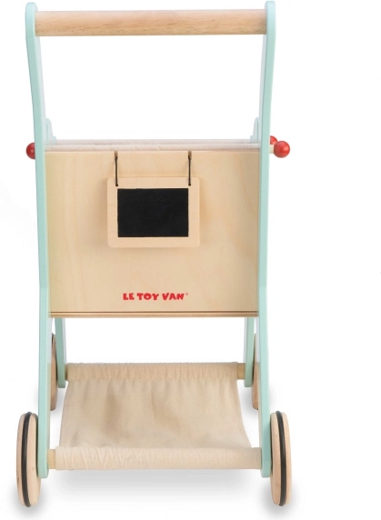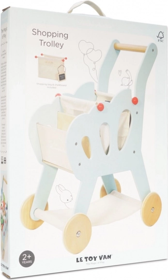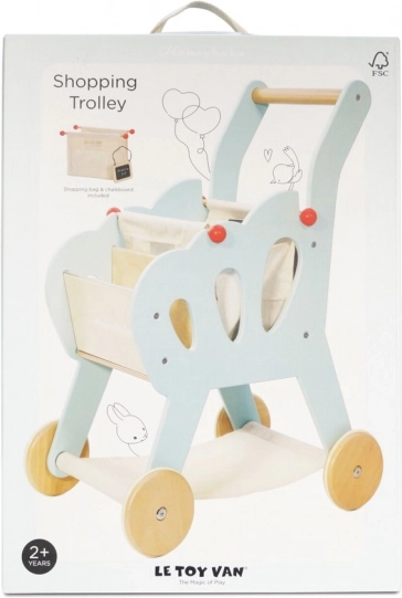 Den stilfulde træindkøbsvogn fra LE TOY VAN i pastelblå farve stimulerer fantasifuld leg, udvikler finmotorik og sociale færdigheder. Den tilbyder to indvendige rum, nedre opbevaringsplads, en stofpose og en lille tavle til indkøbsseddel. Fremstillet af FSC-certificeret træ, sikkert afrundet og hånddekoreret med giftfri vandbaserede farver.