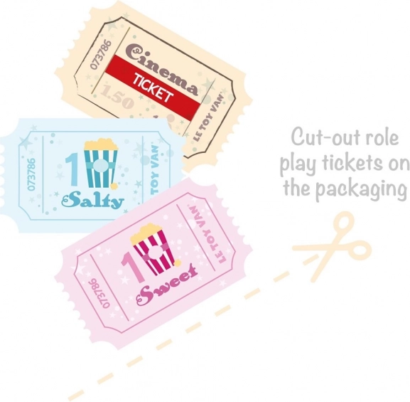 Der medfølger biografbilletter og kort til sød/salt popcorn, som udvikler sprog, kognitive evner og rolleleg med venner.
