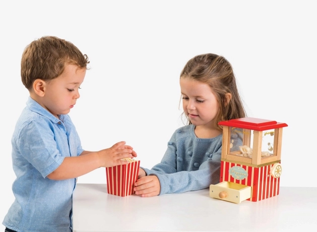 Lav biograf derhjemme med den magiske træ-popcornmaskine fra LE TOY VAN. Dette vintage sæt i rød–creme design bringer fantasifuld leg, understøtter finmotorik og sproglig udvikling. Takket være håndtagsmekanismen til “pop”, 5 filt-popcorn, en skuffe og en popcornæske er legen realistisk og utrolig sjov. Fremstillet af bæredygtigt træ, malet med ikke‑giftige vandbaserede farver og testet efter de strengeste standarder.