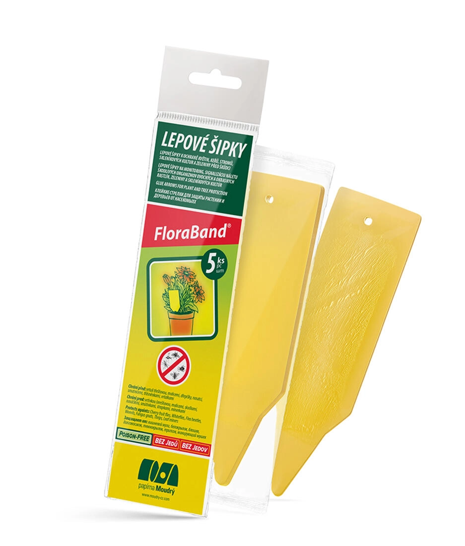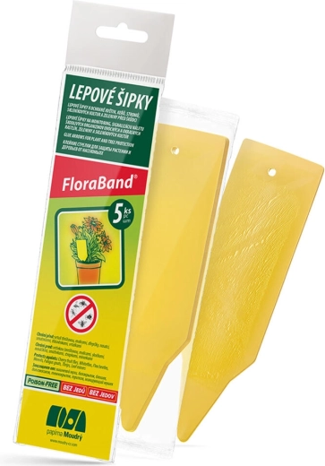 Praktiske klæbrige pile Flora Band beskytter effektivt stue- og haveplanter mod skadedyr. Takket være den iøjnefaldende gule farve tiltrækker de pålideligt skadedyr, og den klæbende overflade fanger dem hurtigt. Pakken indeholder 5 stk. pile – 3 dobbeltsidigt klæbende og 2 enkeltsidigt klæbende – til nem placering direkte i substratet.