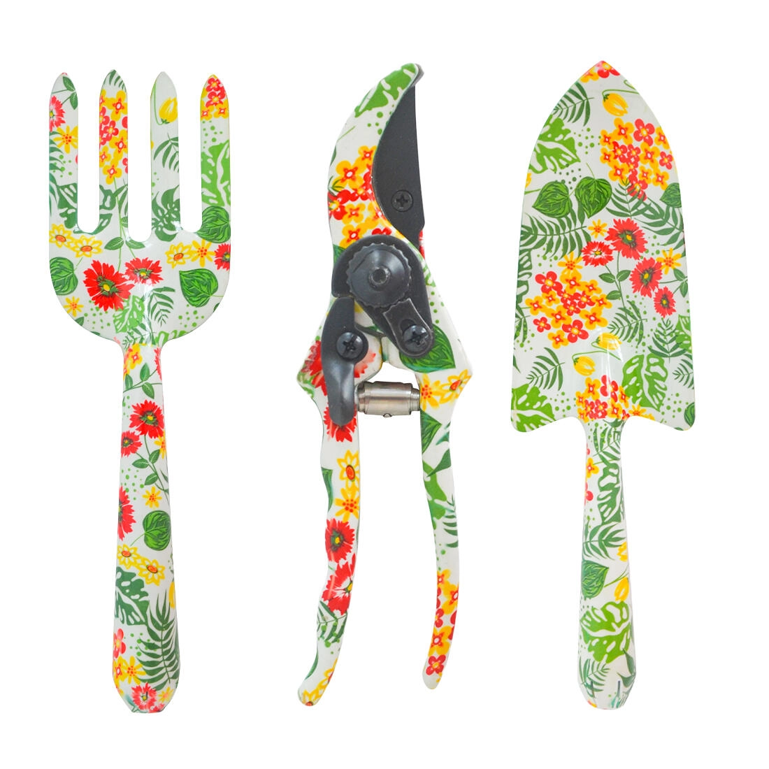 Elegant havesæt i 3 dele i hvid med lyserød blomsterdekoration til daglig plantepleje. Indeholder jordløsner, håndskovl og havesaks, alt i en praktisk gaveæske. Ideel til omplantning, løsning af jord, lugning og beskæring af planter.