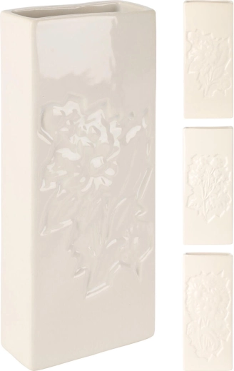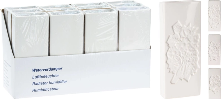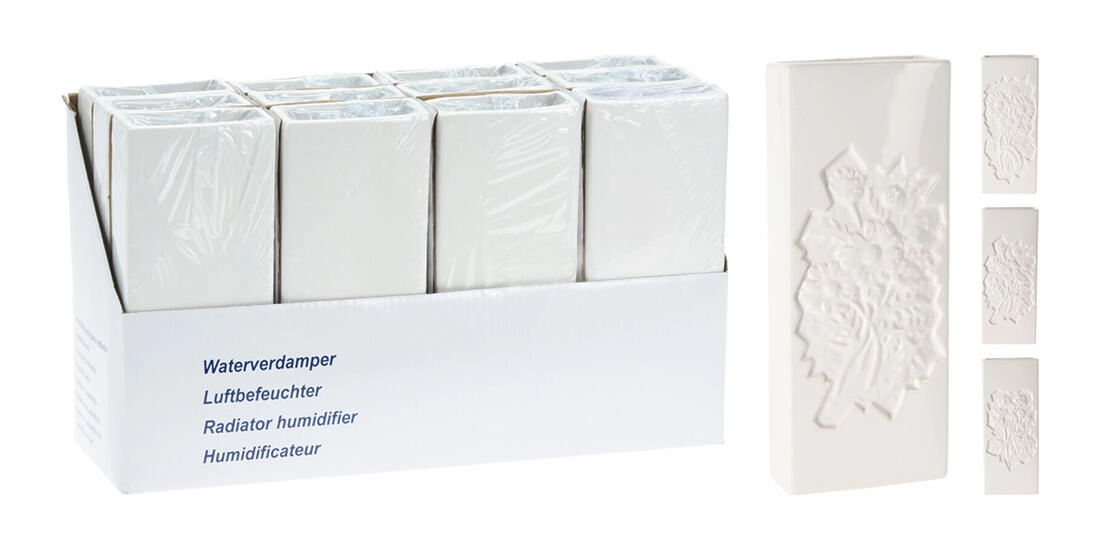 Elegant keramisk radiatorfordamper med et præget blomstermotiv hjælper med naturligt at fugte luften i tørre rum. Takket være den praktiske krog kan den nemt hænges på de fleste radiatorer. Kompakte mål 20,5 × 8 × 3,5 cm sparer plads, og den hvide farve passer ind i enhver indretning.