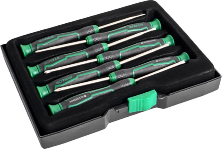 Det praktiske 7-delige præcisionsskruetrækkersæt fra STALCO er ideelt til fint arbejde på elektronik, briller, legetøj og små mekaniske dele. Det tilbyder en kombination af flade og krydskærvshoveder til alsidig brug og præcis skruning på svært tilgængelige steder. Sættet sikrer pålidelighed, komfortabel håndtering og bred kompatibilitet med de mest almindelige små skruer.