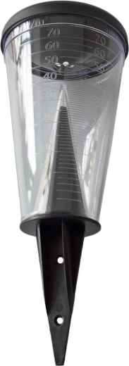 Det tragteformede låg beskytter mod fordampning og opfanger effektivt regndråber. Den praktiske holder kan nemt stikkes i jorden eller fastgøres på en stang (stang medfølger ikke), hvilket giver fleksibel placering for den mest præcise måling.
