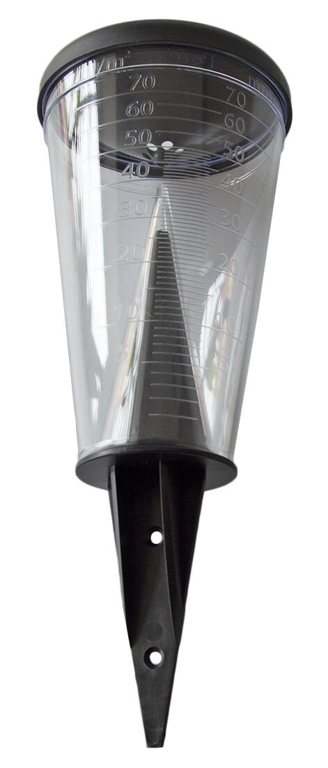 Moderne regnmåler med stor diameter til præcis måling af nedbør i området 0–70 mm/m². Tilbyder let aflæselig skala, vejrsbestandighed og en praktisk holder til nedstikning i jorden eller montering på en stang. Låget i tragteform begrænser fordampning og sikrer opsamling af tilstrækkelige dråber.