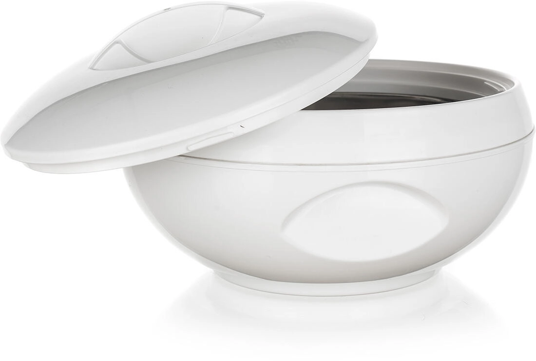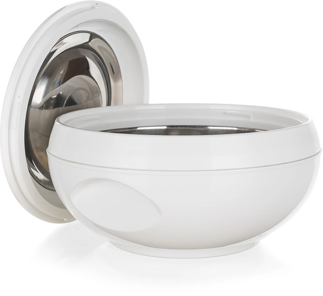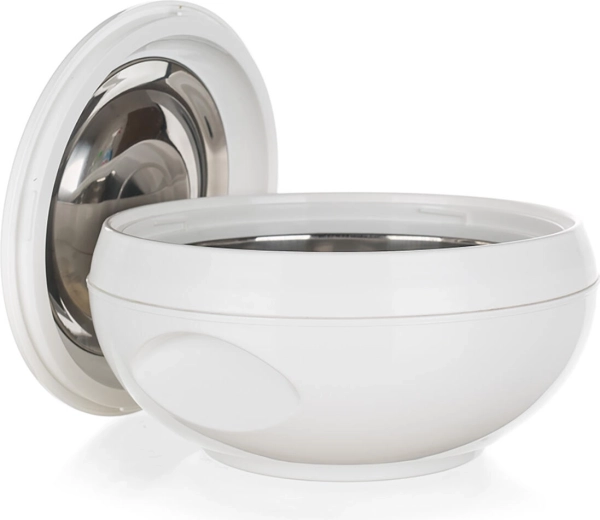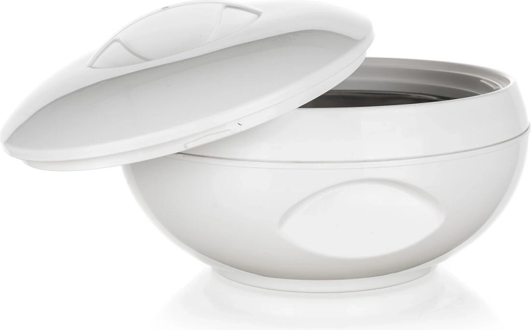 Takket være det tætsluttende låg og det robuste ydre i plast er termoskålen perfekt til både transport og opbevaring. Det elegante hvide design passer let ind ved enhver borddækning – derhjemme, til havefesten eller ved familiesammenkomster.