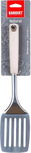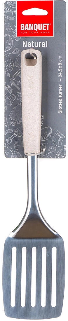 Håndtaget af polypropylen og hvedeklid ligger behageligt i hånden og giver nem håndtering. Takket være det praktiske øje kan redskabet let hænges op og altid være inden for rækkevidde. De rummelige mål 34,5 × 8 cm gør det lettere at vende større portioner, pandekager eller fileter.