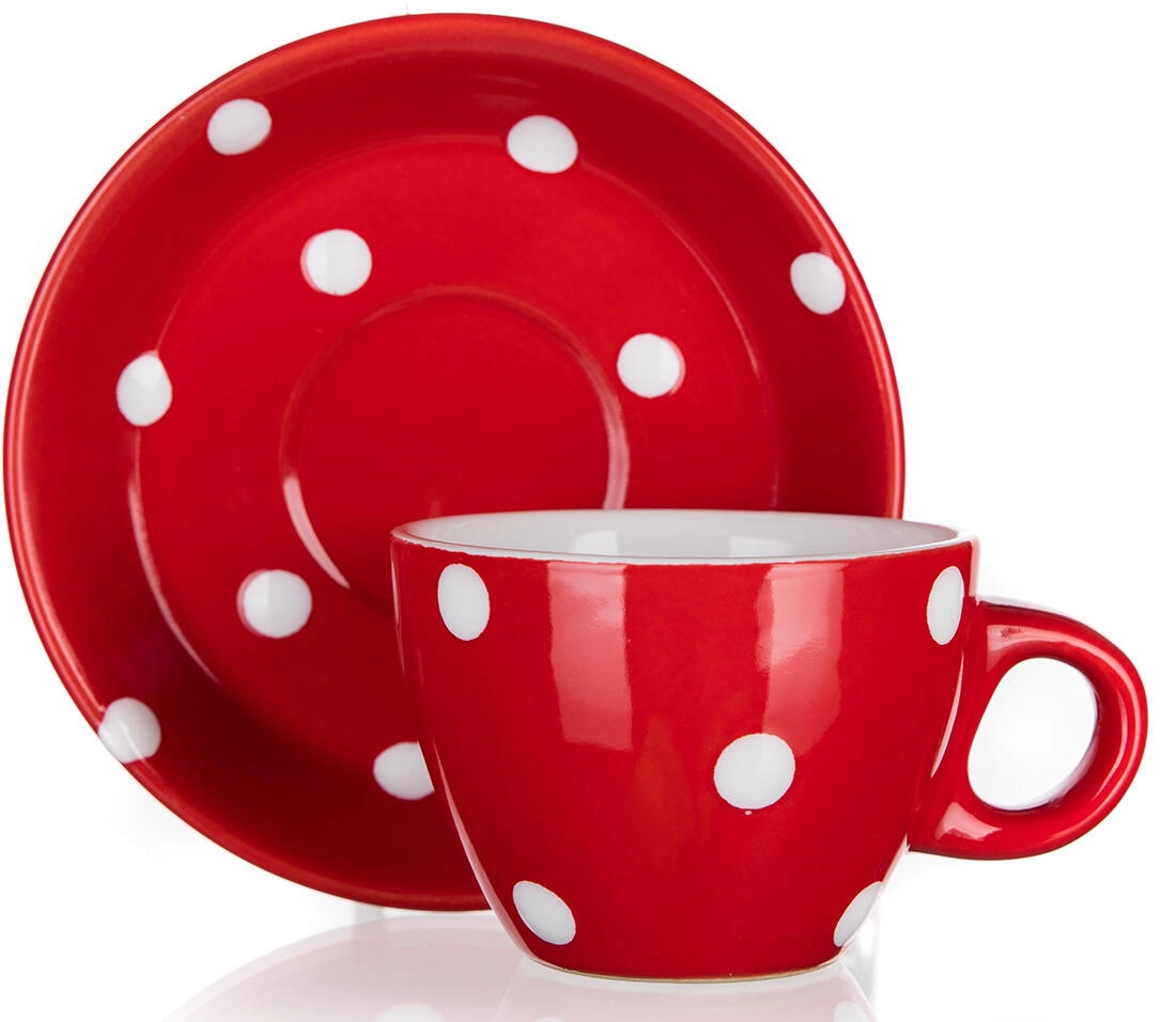Stilfuld keramisk kop med underkop med et volumen på 100 ml i rød farve med hvide prikker, der glæder i daglig brug. Takket være det holdbare materiale er den egnet til mikrobølgeovn og opvaskemaskine, så du kan nyde din yndlingskaffe eller espresso bekvemt og uden bekymringer.