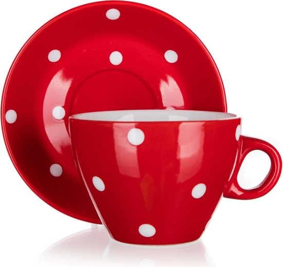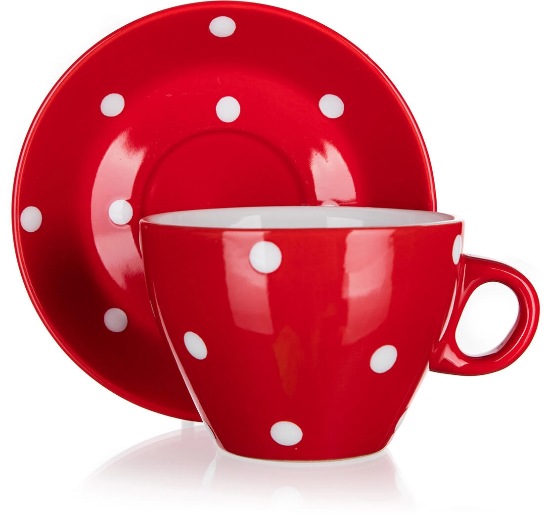 Stilfuld keramisk kop med underkop på 290 ml i rød farve med hvide prikker, som giver dit bord en legende touch. Den er fremstillet af kvalitetskeramik, er egnet til mikrobølgeovn og tåler opvaskemaskine, så den er ideel til daglig brug.