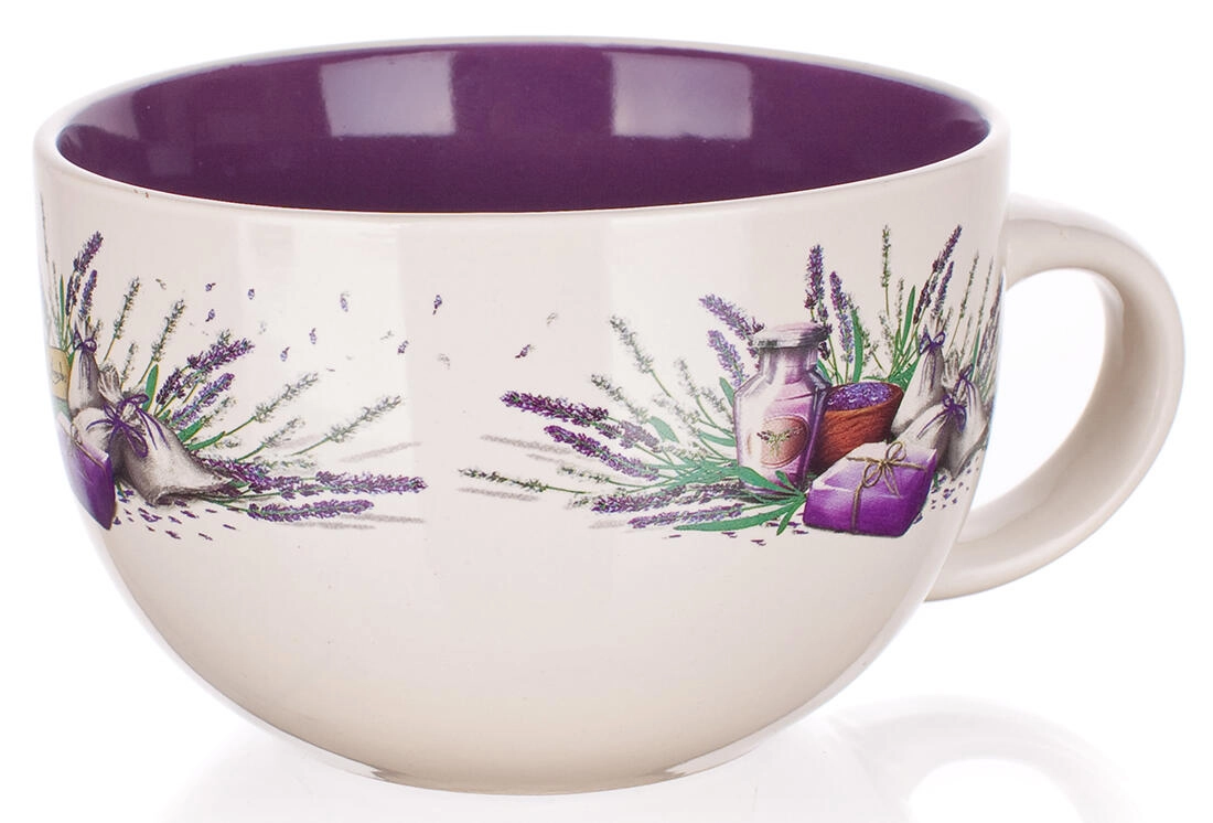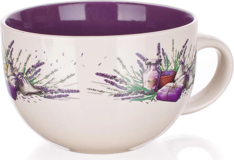 Stilfuldt jumbo-krus med lavendelmotiv og en kapacitet på 660 ml, perfekt til daglig brug. Det har en tofarvet glasur, behagelig drikning takket være den brede diameter på 13 cm og er egnet til mikroovn og opvaskemaskine for nem vedligeholdelse.