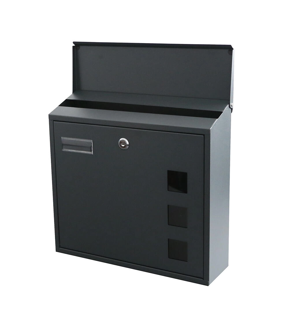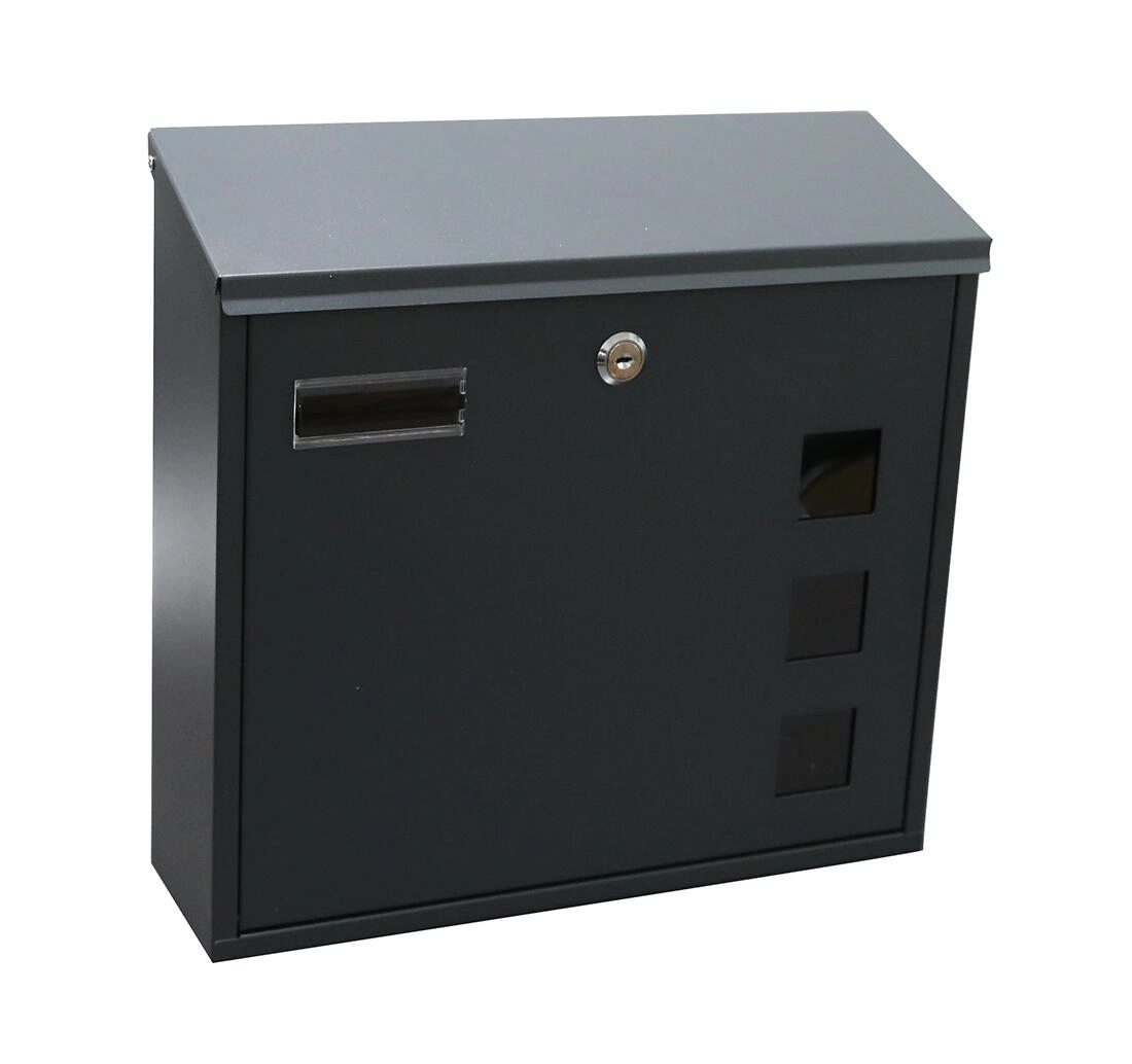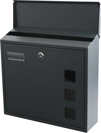 Praktisk udendørs postkasse i elegant antracit med målene 350 × 330 × 110 mm. Den har øverste brevindkast, frontlåge med nøgle for nem tømning af posten og let montering gennem bagvæggen. Pakken indeholder skruer og rawlplugs, desuden cylinderlås med 2 nøgler og en gennemsigtig navneskilt.