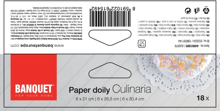 Et elegant sæt runde papirblonde-underlag fra CULINARIA, der fremhæver serveringen af kager, skærekager og salte retter. I pakken finder du tre populære diametre til alsidig brug. Underlagene med fin blondesværing giver bordet et festligt præg, forbedrer præsentationen og beskytter samtidig fade og tallerkener. Ideelle til hjemmebag, fester og catering. 18 stk. i pakken, 3 forskellige størrelser, dekorativ blondekant, hygiejniske og engangs.