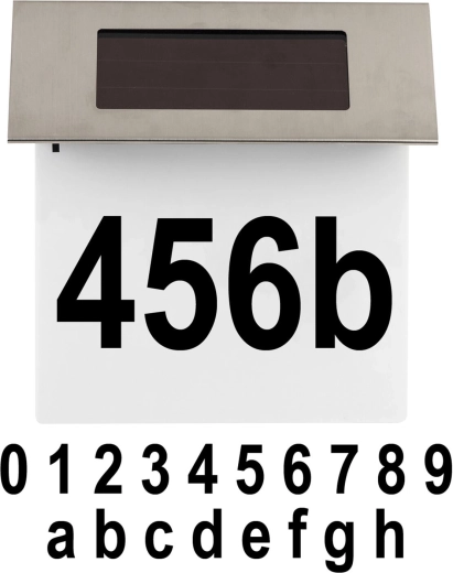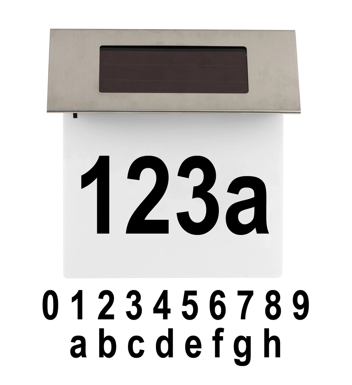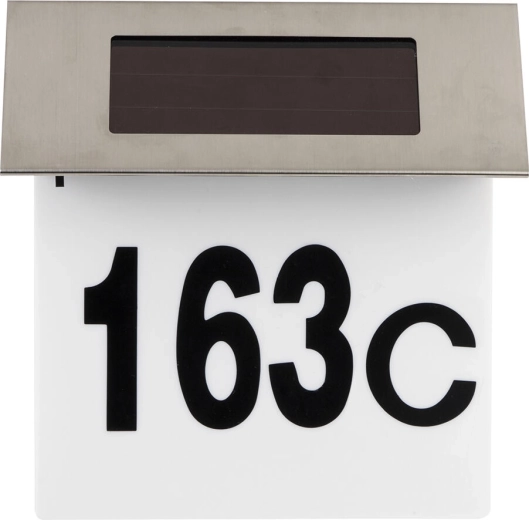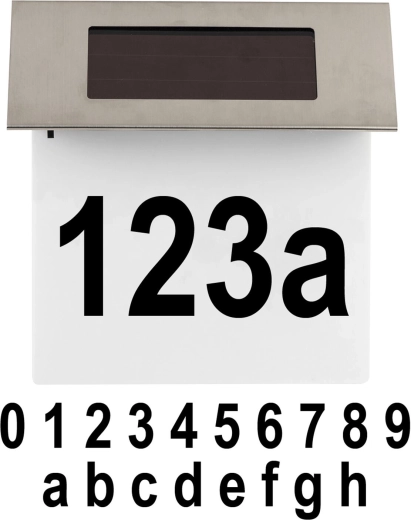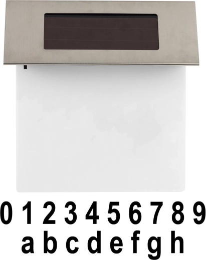 Gør din adresse synlig dag og nat. Solcelledrevet LED-lampe til husnummer med kabinet i rustfrit stål og hvid bagbelyst plade giver pålidelig belysning takket være det integrerede solpanel og det genopladelige batteri. Ingen kabler, med ON/OFF-kontakt og IP44-klassificering til helårsbrug.