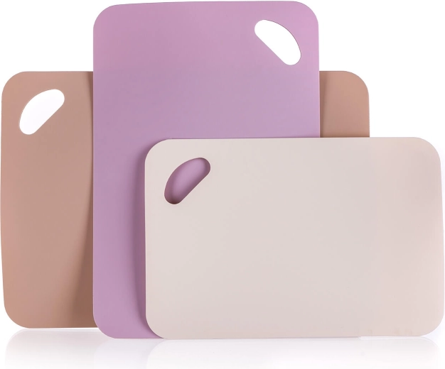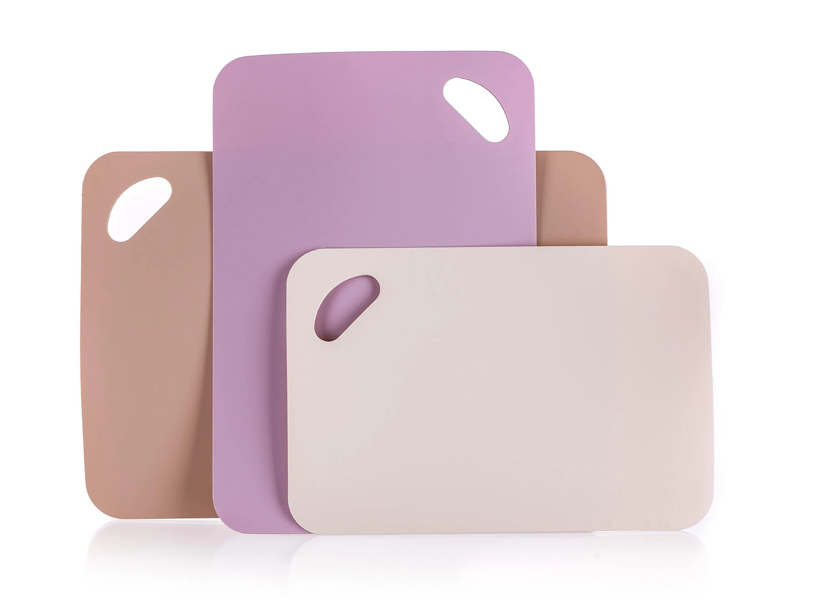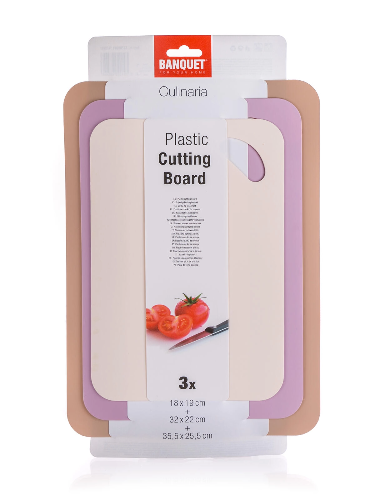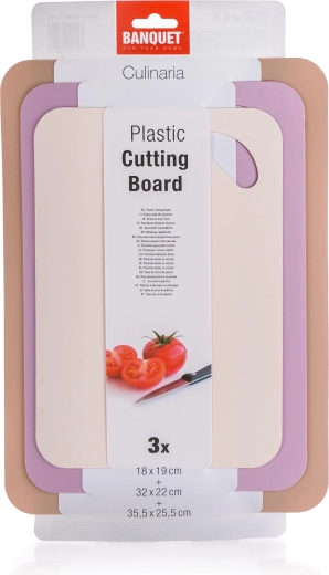 Praktisk sæt med tre skærebrætter til daglig madlavning. Forskellige størrelser og skridsikker overflade giver sikker udskæring, robust plast er nem at rengøre, og ophængshuller gør opbevaringen let. Elegant farvemix i beige, brun og lilla fuldender dit køkken.