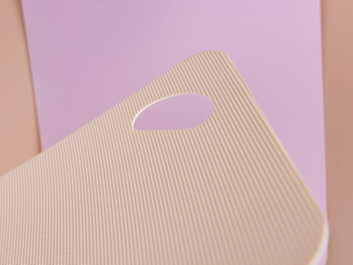 Den teksturerede plast sikrer bedre vedhæftning af råvarer og mere sikker skæring, er skånsom mod knivens æg og ikke-absorberende.