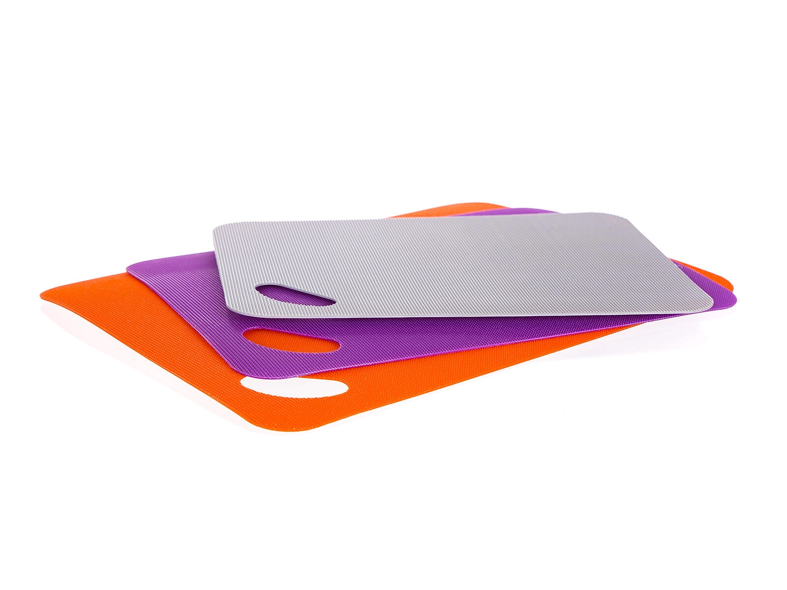 Sættet med skridsikre skærebrætter CULINARIA giver tre alsidige størrelser til skæring af grøntsager, kød og brød. Den teksturerede, ikke-porøse overflade er skånsom mod knivens æg og minimerer, at råvarer glider under arbejdet.